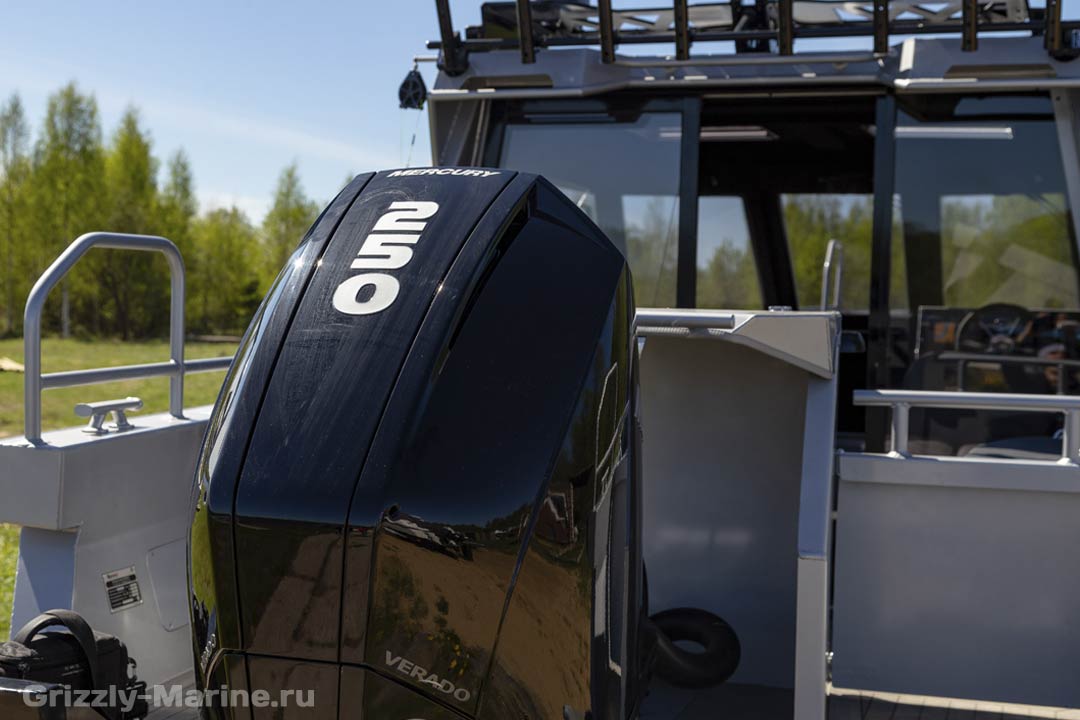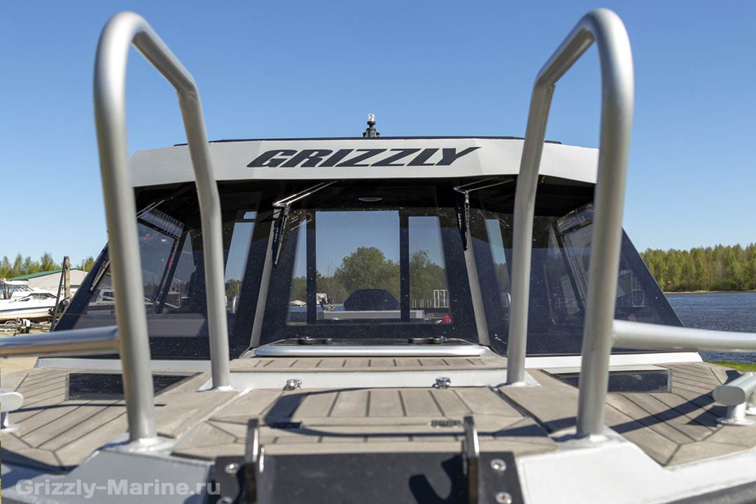 Особая деталь внешней части корпуса как и в модели GRIZZLY G680 PRO Cruiser: конструкция привального бруса. Его внешняя часть покрыта особым материалом – Line-X. Он широко применим в тюнинге больших полноприводных автомобилей и крупных пикапов. Создавая особый стиль, но в первую очередь, обладая особыми конструктивными свойствами: повышенной устойчивости к истиранию и повреждению. Что и нашло применение в конструкции привального бруса, где это особенно ценно. Ведь классическое покрытие – резина, имеет свойство быстро повреждаться, устаревать, теряя первозданный облик. Конструкция привального бруса благодаря большей толщине немного выступает за границы корпуса и выполняет функцию брызгоотбойника. Что так же является уникальным для катеров данного класса. Более того, увеличивает такая форма привального бруса и площадь подтопчины, что делает перемещение вдоль борта более удобным и безопасным. Способствуют этому и удобные, крепкие рейлинги, размещённые по периметру всего корпуса. Они так же обладают дополнительным функционалом, позволяя не только держаться во время перемещения по катеру, но и использовать для крепления грузов. И в верхней части рубки служат дополнительной защитой для ходовых огней. Что очень важно во время швартовки к высокой причальной стенке или «шлюзовании», так как не позволят повредить огни в случае сильной качки.