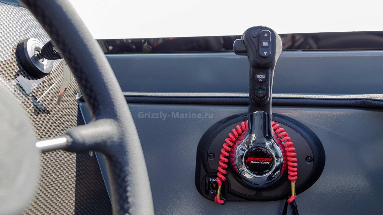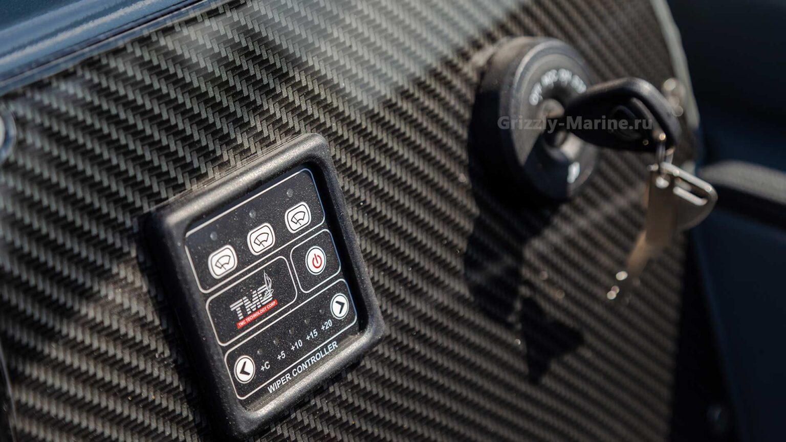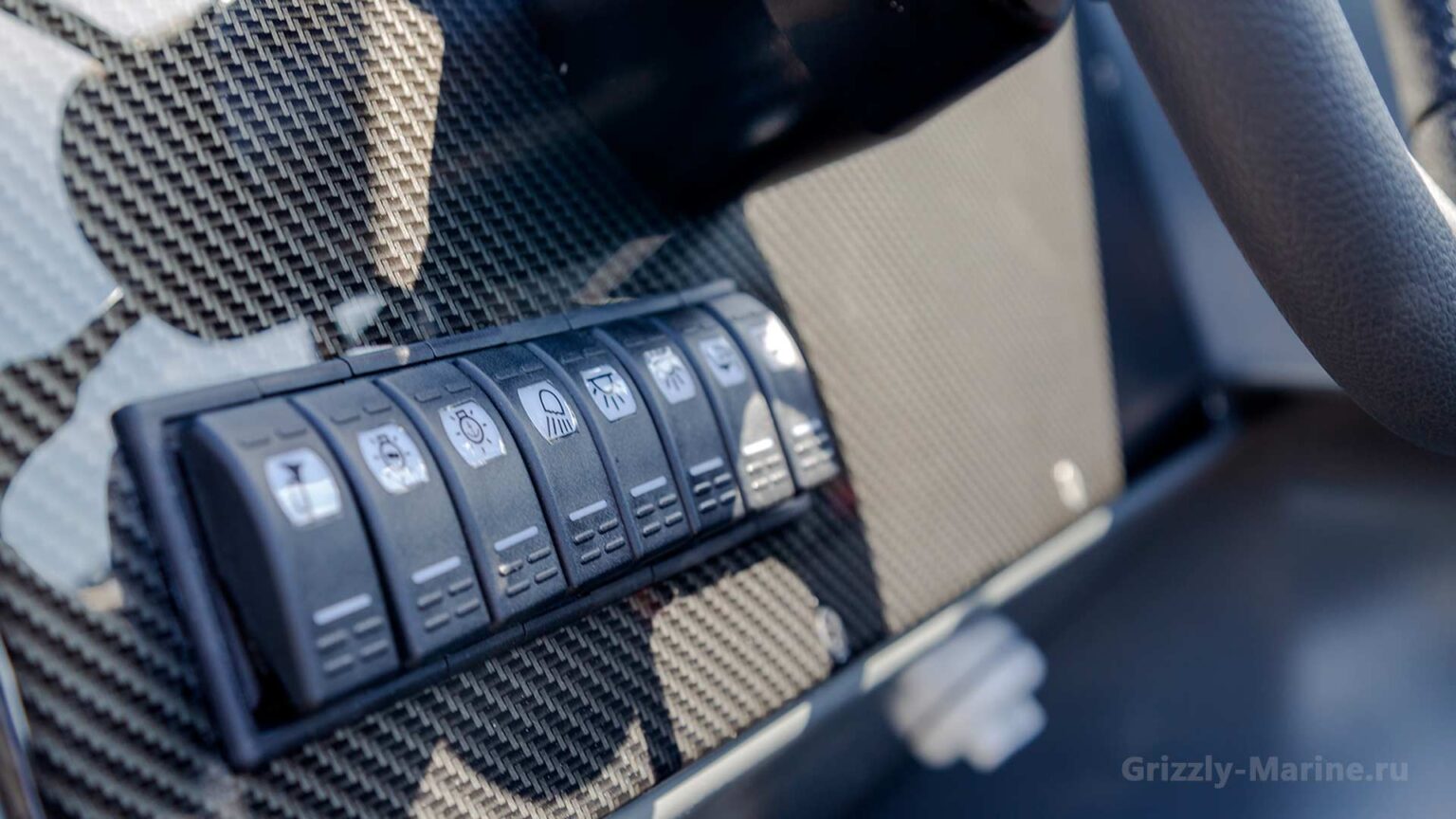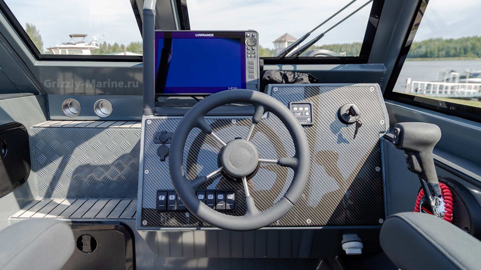 Управление катером максимально удобно и комфортно, на консоли управления размещены все основные приборы, фиксирующие наиболее важные показатели работы двигателя, уровень топлива и т.д. Удобно размещены тумблеры включения систем освещения, дворников, водоотливных помп и так далее.